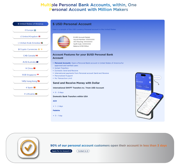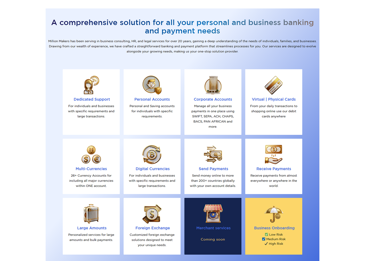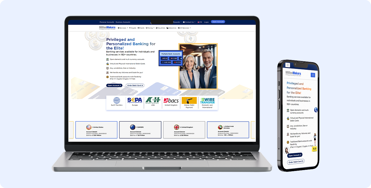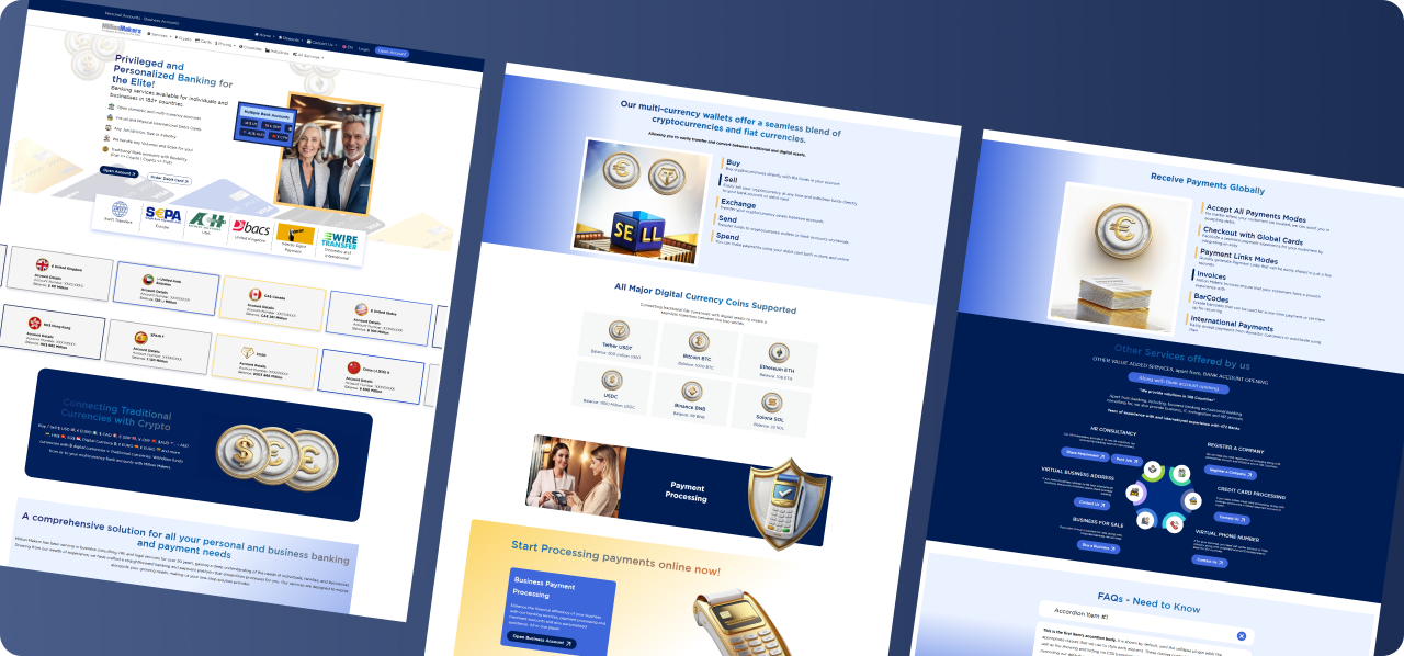 Bank Millionmakers is a specialized platform developed by Million Makers to simplify access to international banking services for individuals and businesses worldwide. The website offers a seamless experience for users looking to open personal or corporate bank accounts in various countries, including offshore and high-risk jurisdictions. With a professional and informative layout, the site guides users through the entire banking process from selecting the right financial institution to understanding compliance and legal requirements. It also features a secure, multi-step inquiry form to ensure client data protection. Designed for a global audience, the portal is multilingual, responsive, and optimized for fast performance, reflecting the brand’s commitment to trust, transparency, and efficiency in financial services.